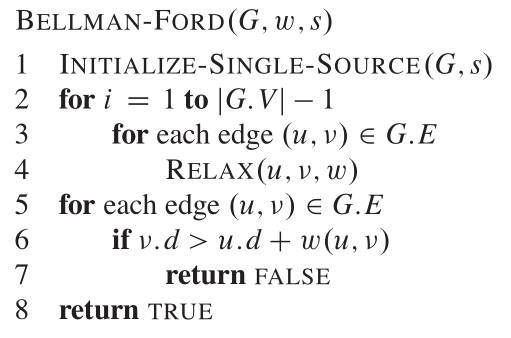 由于算法第 1 行的初始化操作所需时间为 , 第 2-4 行循环的运行时间为 , 且一共要进行 次循环, 第 5-7 行的 for 循环的所需时间为 , Bellman-Ford 算法的总运行时间为 O(VE)